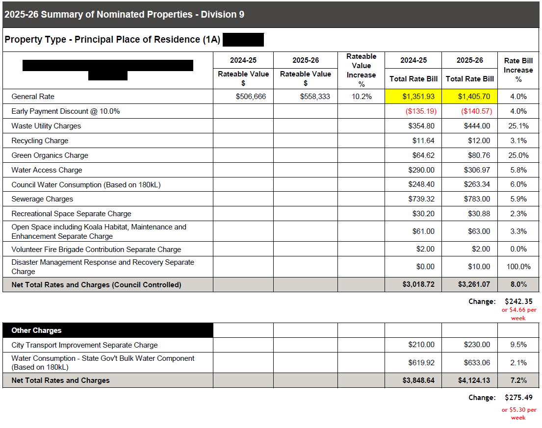 For the sake of transparency, and now that rates notices are being sent to residents, I'm sharing information about my own rates notice (see image below), where it shows my property has increased in value by 10.2% and my general rate has increased by 4% (which I acknowledge is higher than the 2.7% (CPI) noted in official media statements by others). One reason for the larger general rate increase is because my property valuation (averaged over three years) increased by 10.2% - which is higher than the City-wide average change of 7.68%. The other items on the example are charges common to most rate notices. Overall this year, Jude and I will be paying about $5.30 per week more than last year. We live in a small-ish 3 bedroom ensuite house with a pool and a studio/shed in Mudgeeraba, not far from Mudgeeraba State School.